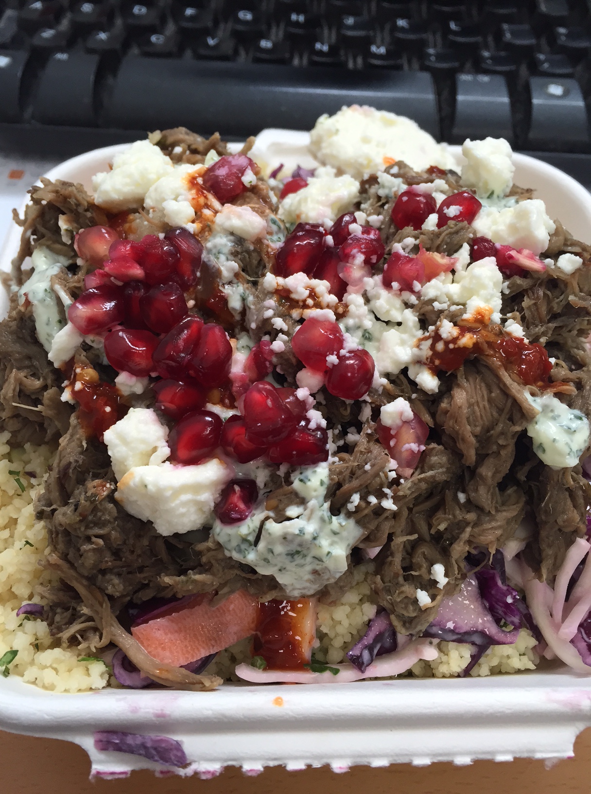 I eventually settled on Sour Jerk Co. who were offering pulled lamb shoulder on herby cous cous generously garnished with feta and pomegranate seeds. Now, this appealed for a number of reasons which I’ll list now.
