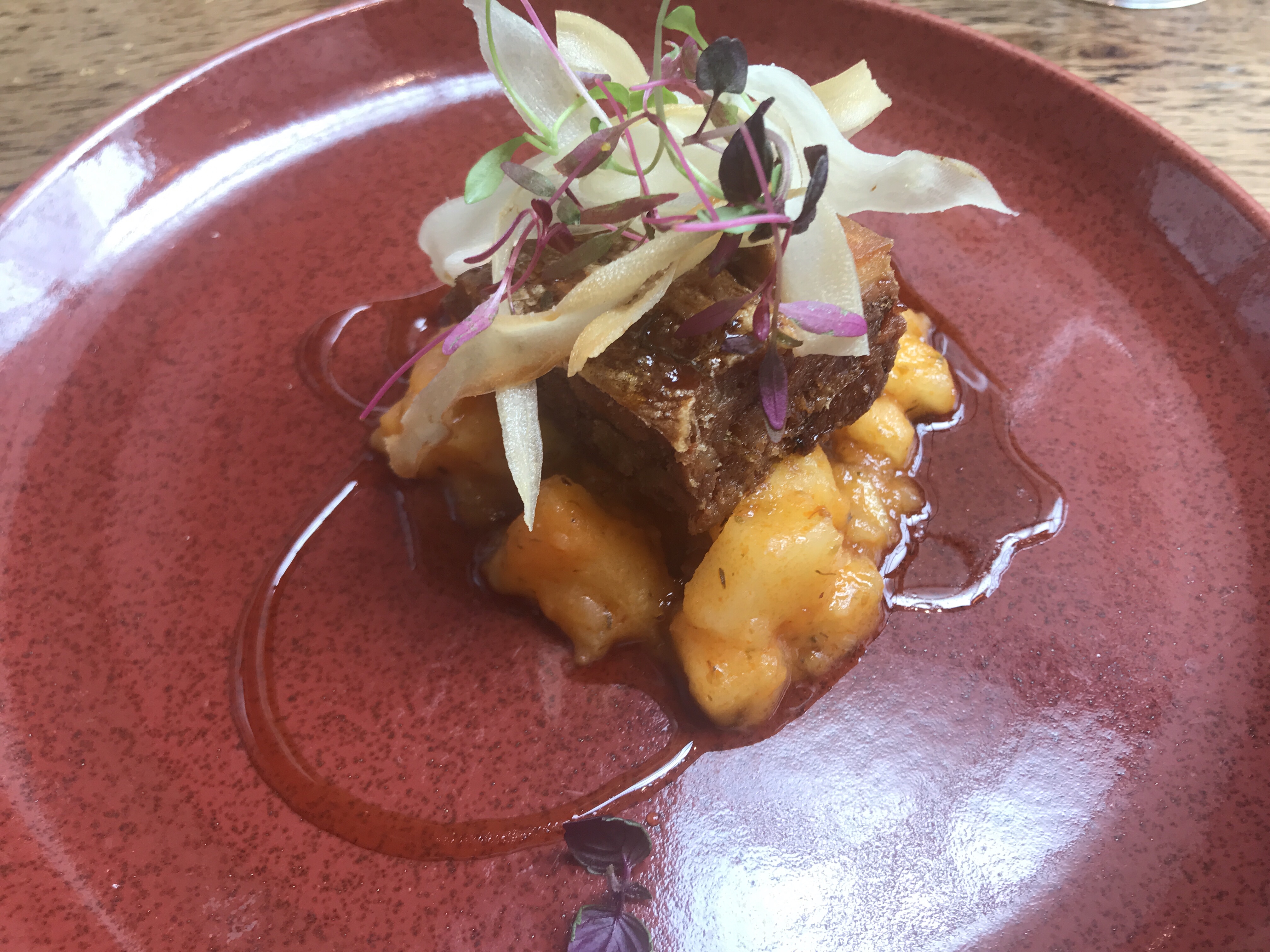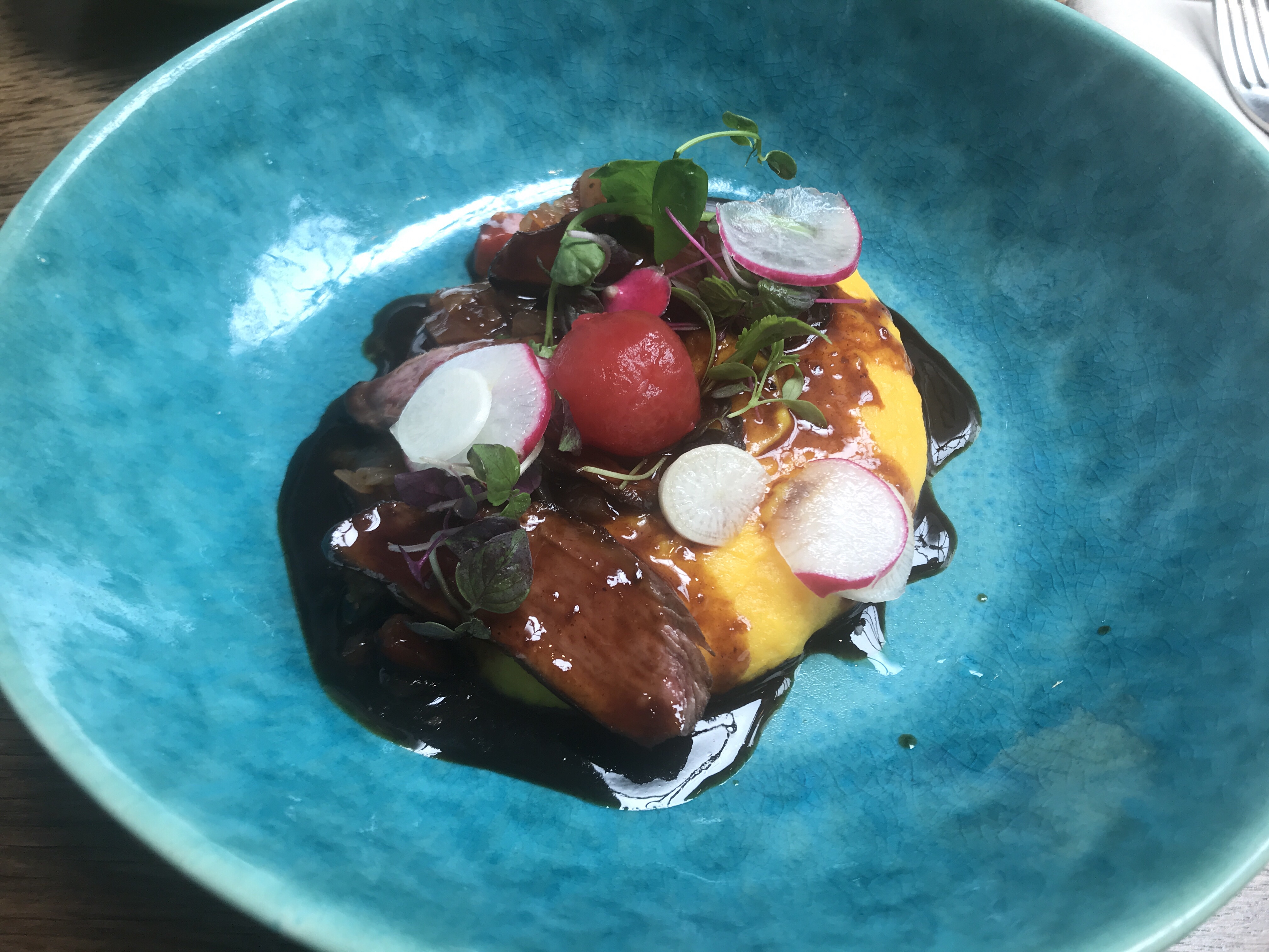 To my massive surprise, a bowl of raw fish actually went down pretty well, as did the next dish ‘Duck escabeche’. Two rather miserly pieces of duck on top of a delicious, sweet and acidic brown sauce – a sauce so shiny I could see my own face in it – which in my state was not appreciated.