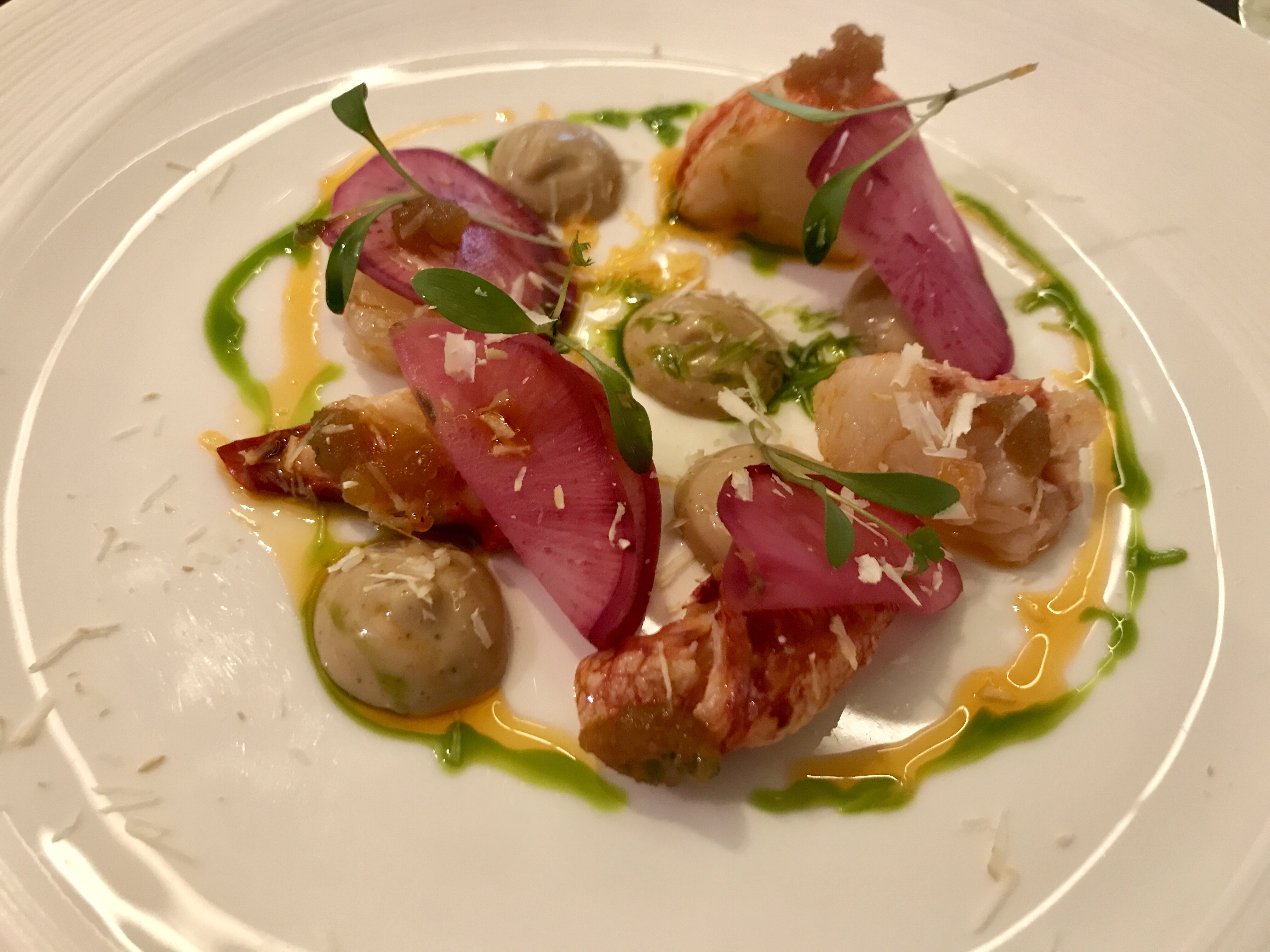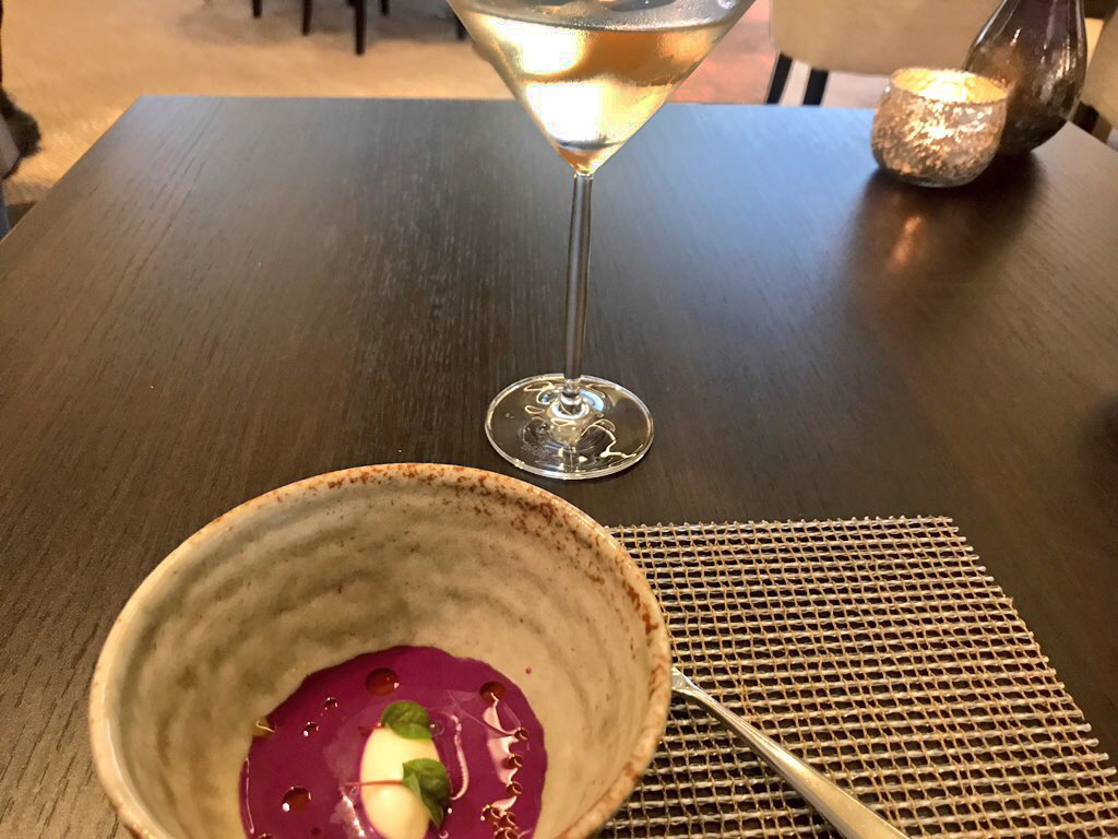The first was a horseradish ice cream with a beetroot (or possibly red cabbage) gazpacho and olive oil. I remember this because it was indeed – very nice.