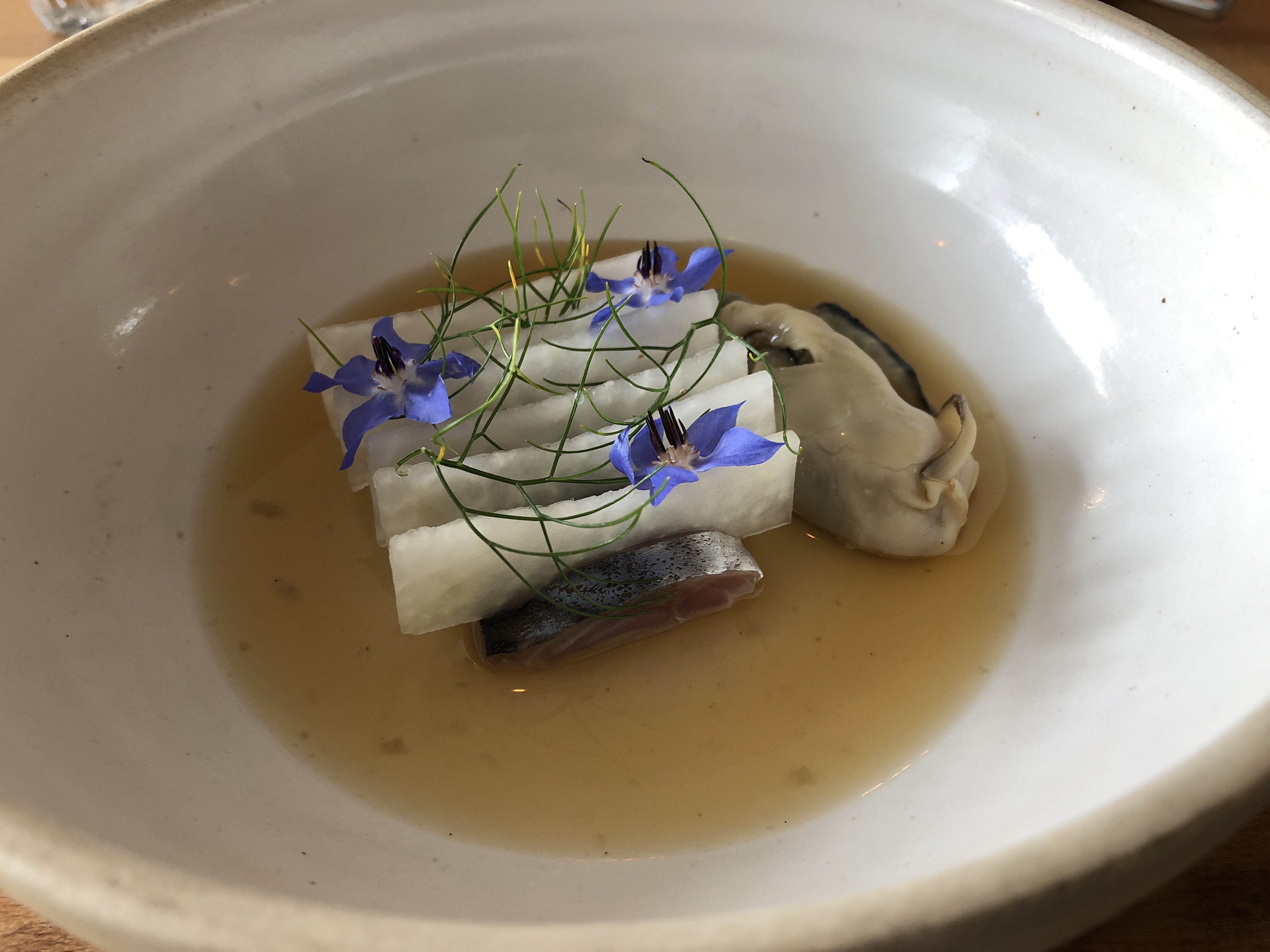 Mackerel, lovage, kohlrabi and oyster poached in mackerel bones.