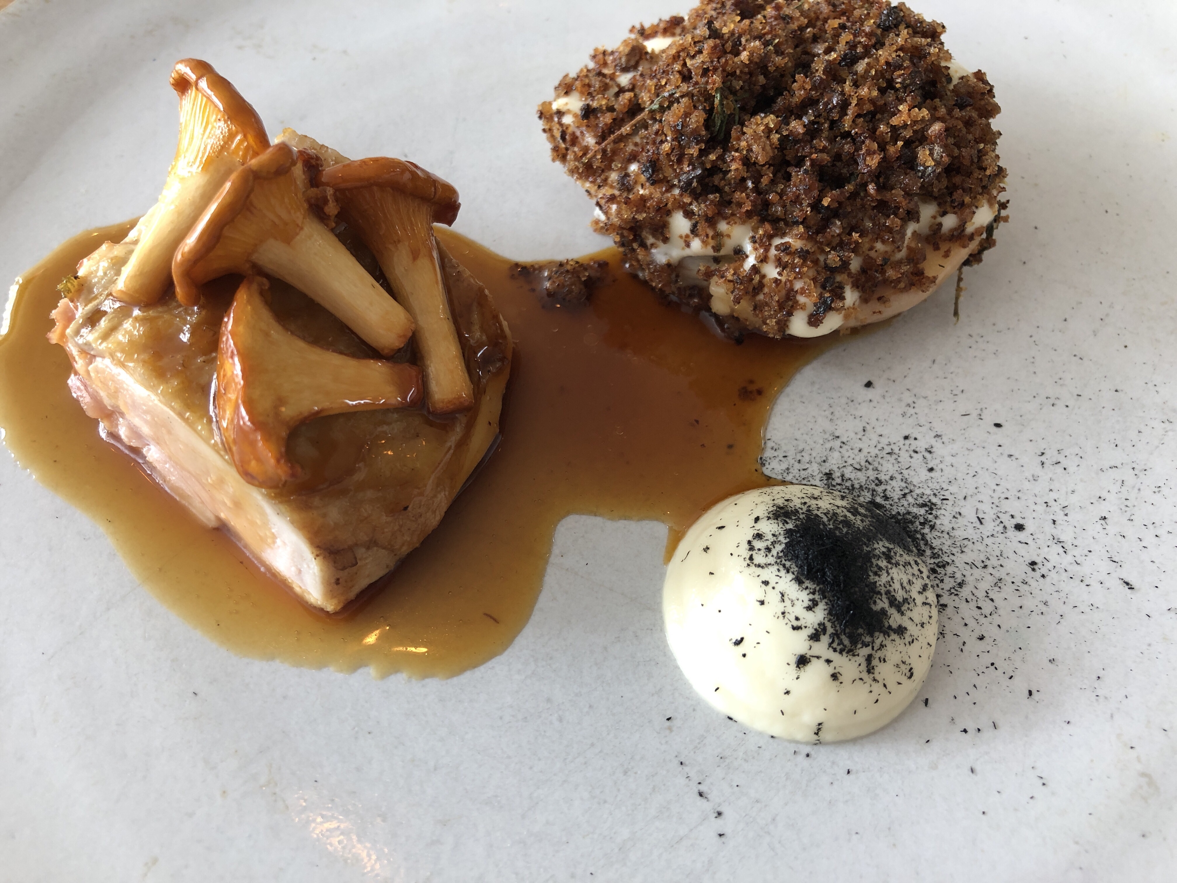 Guinea fowl, girolles, guinea fowl leg with cauliflower moose and old sourdough.